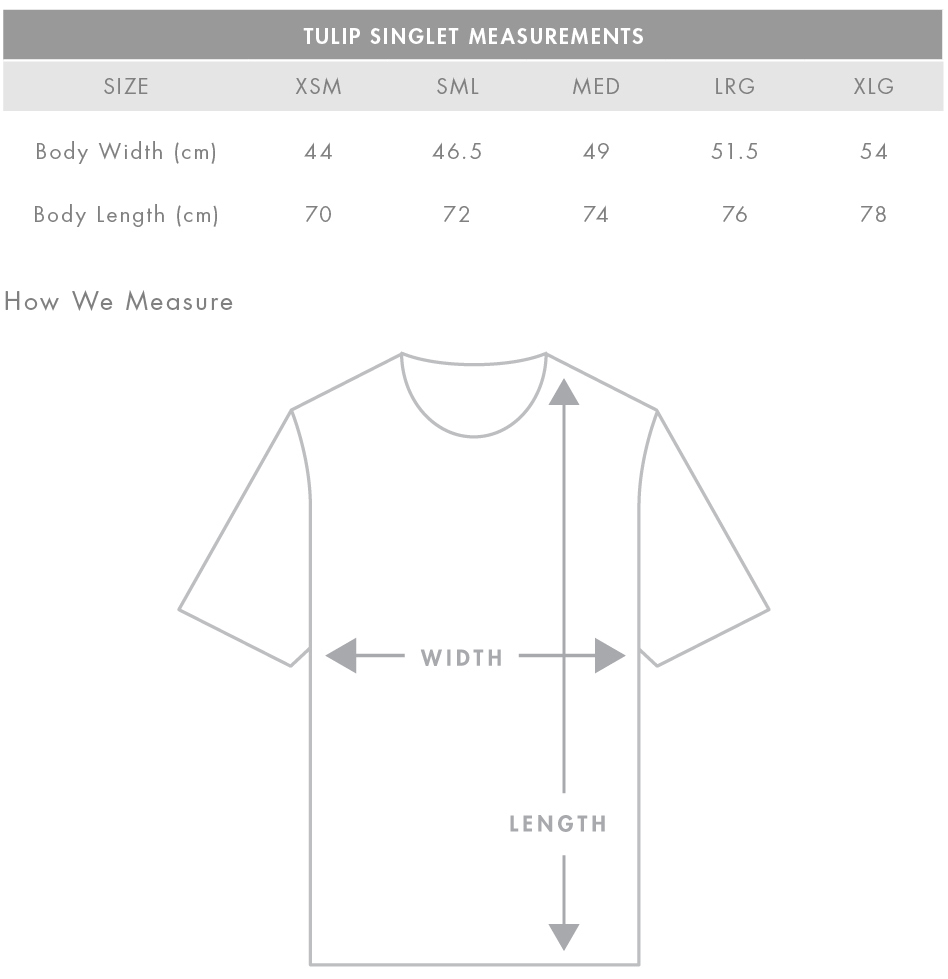 FIT: Regular fit - please check the size chart to avoid disappointment. Lay your own singlet/tee flat on a table, measure armpit to armpit across the chest and match to the size you feel is best. Please note measurements can vary within 2.5cm, this is within the accepted tolerance.