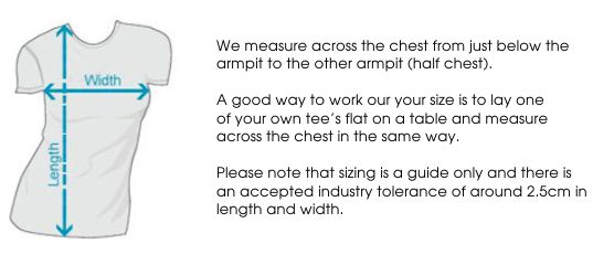FIT: Regular fit - please check the size chart to avoid disappointment. Lay your own tee flat on a table, measure armpit to armpit across the chest and match to the size you feel is best. Please note measurements can vary within 2.5cm, this is within the accepted tolerance.
