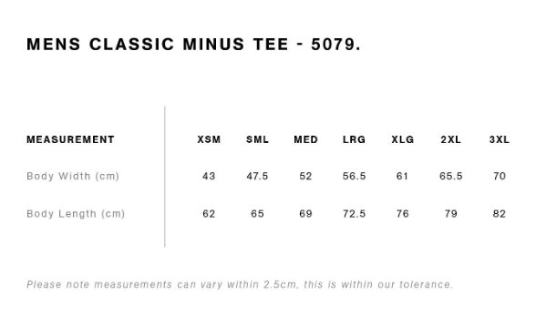 FIT: Regular fit - please check the size chart to avoid disappointment. Lay your own tee flat on a table, measure armpit to armpit across the chest and match to the size you feel is best. Please note measurements can vary within 2.5cm, this is within the accepted tolerance.