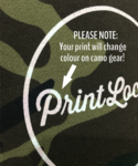 WARNING: The camo pattern may be visible through your print. Your print colour may also change. For example,white/light print colours may change to pink/brown in some areas or yellow prints may turn orange. It actually ends up looking pretty cool but may not be the look you're going for so please consider before purchasing. Example images provided.